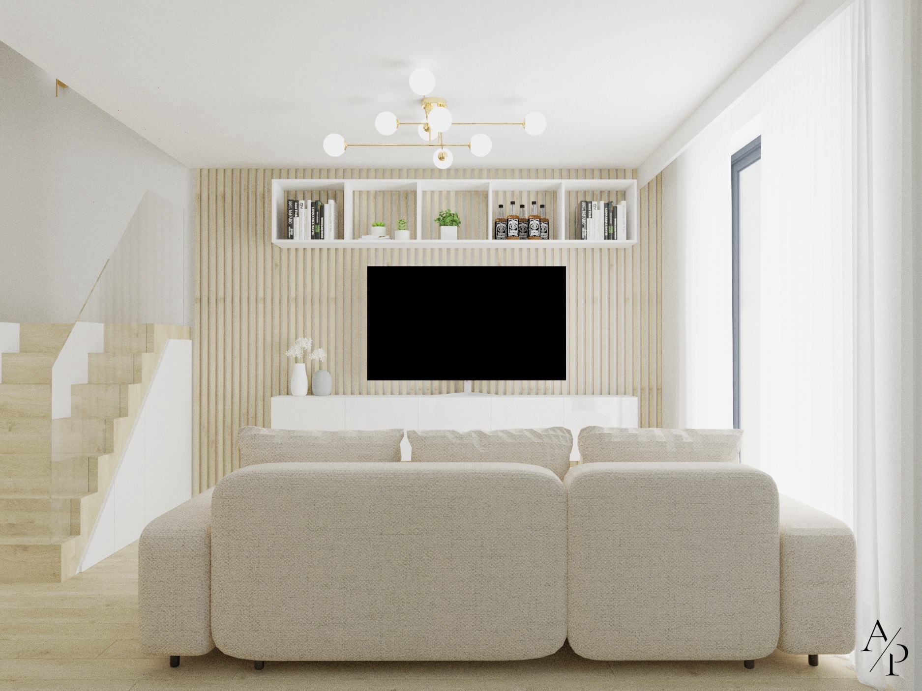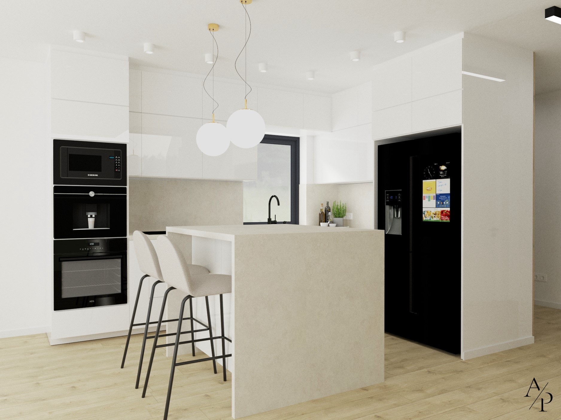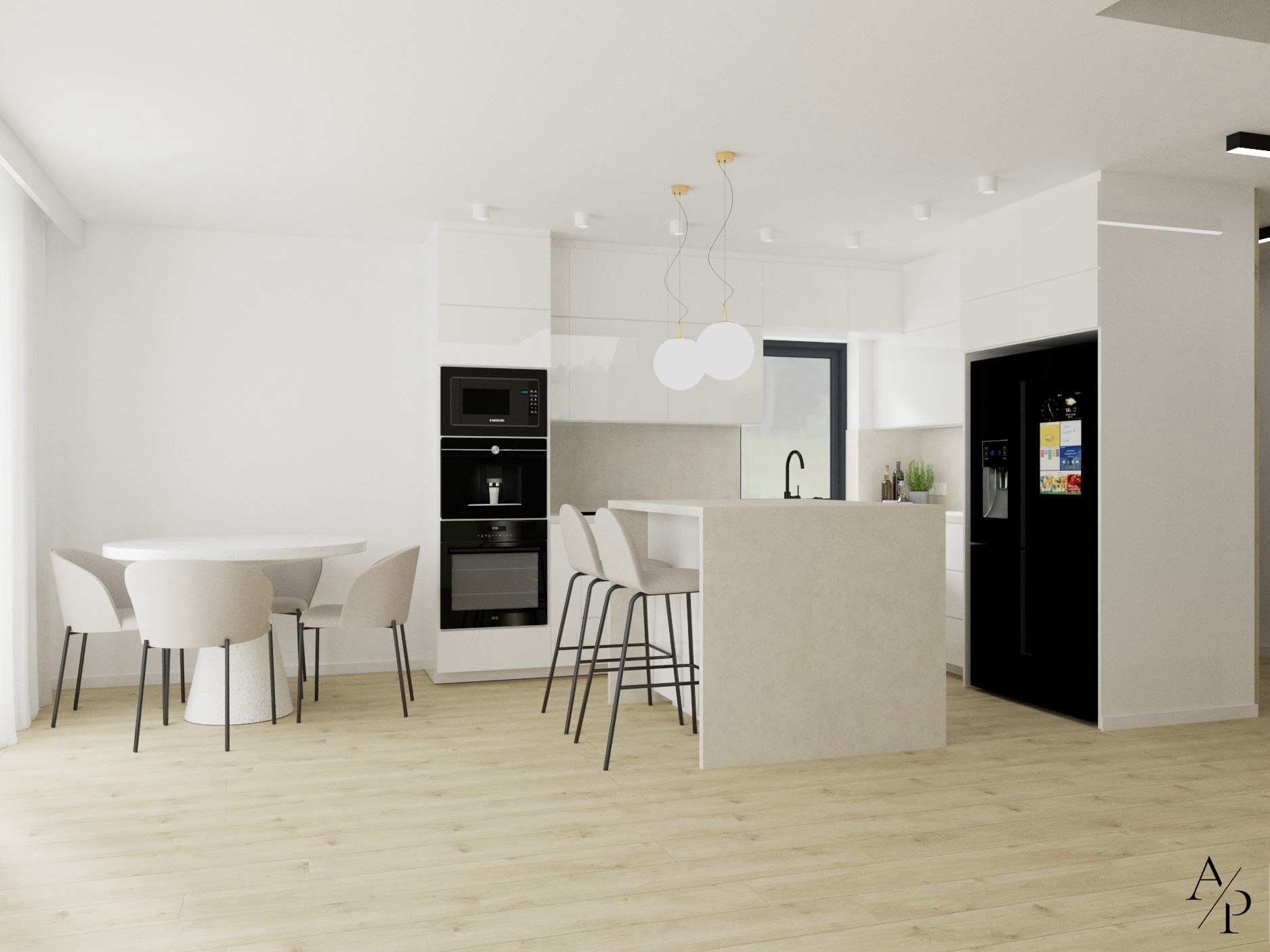 Projekt łączy funkcjonalność z estetyką, tworząc harmonijną i pełną światła przestrzeń. Dominują tu jasne, neutralne barwy, drewno oraz subtelne złote akcenty, które dodają wnętrzu elegancji. Otwarta kuchnia z wyspą i przestronną jadalnią to serce domu, natomiast domowe biuro zostało zaprojektowane z myślą o komforcie pracy – zawiera ergonomiczne stanowiska oraz dodatkową przestrzeń do odpoczynku. Sypialnia na poddaszu zachwyca prostotą i przytulnym charakterem, a całość wnętrza odzwierciedla nowoczesny styl życia i dbałość o detale.