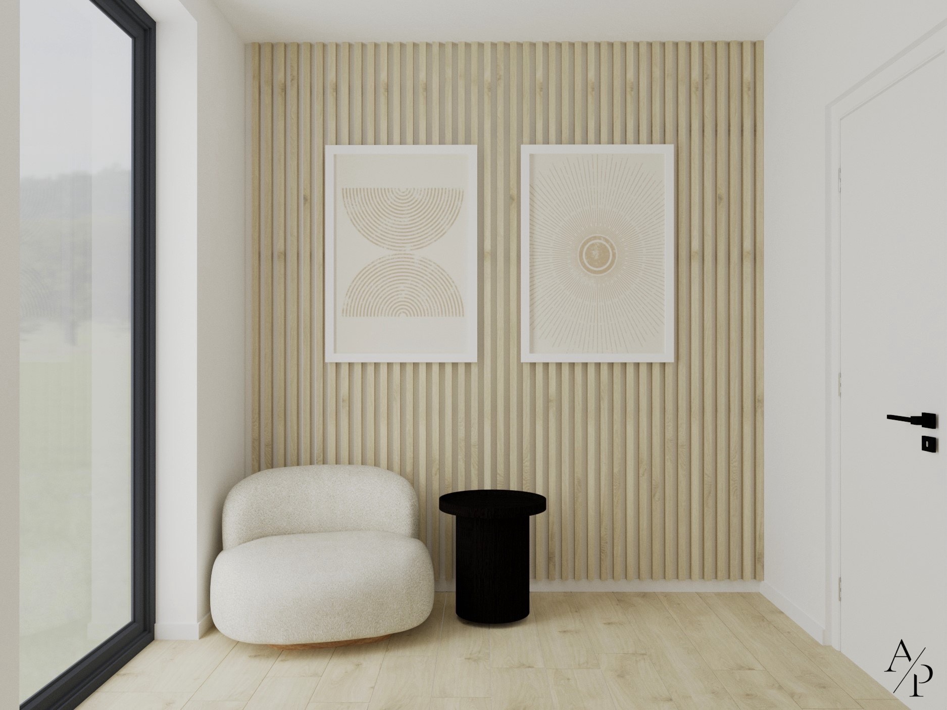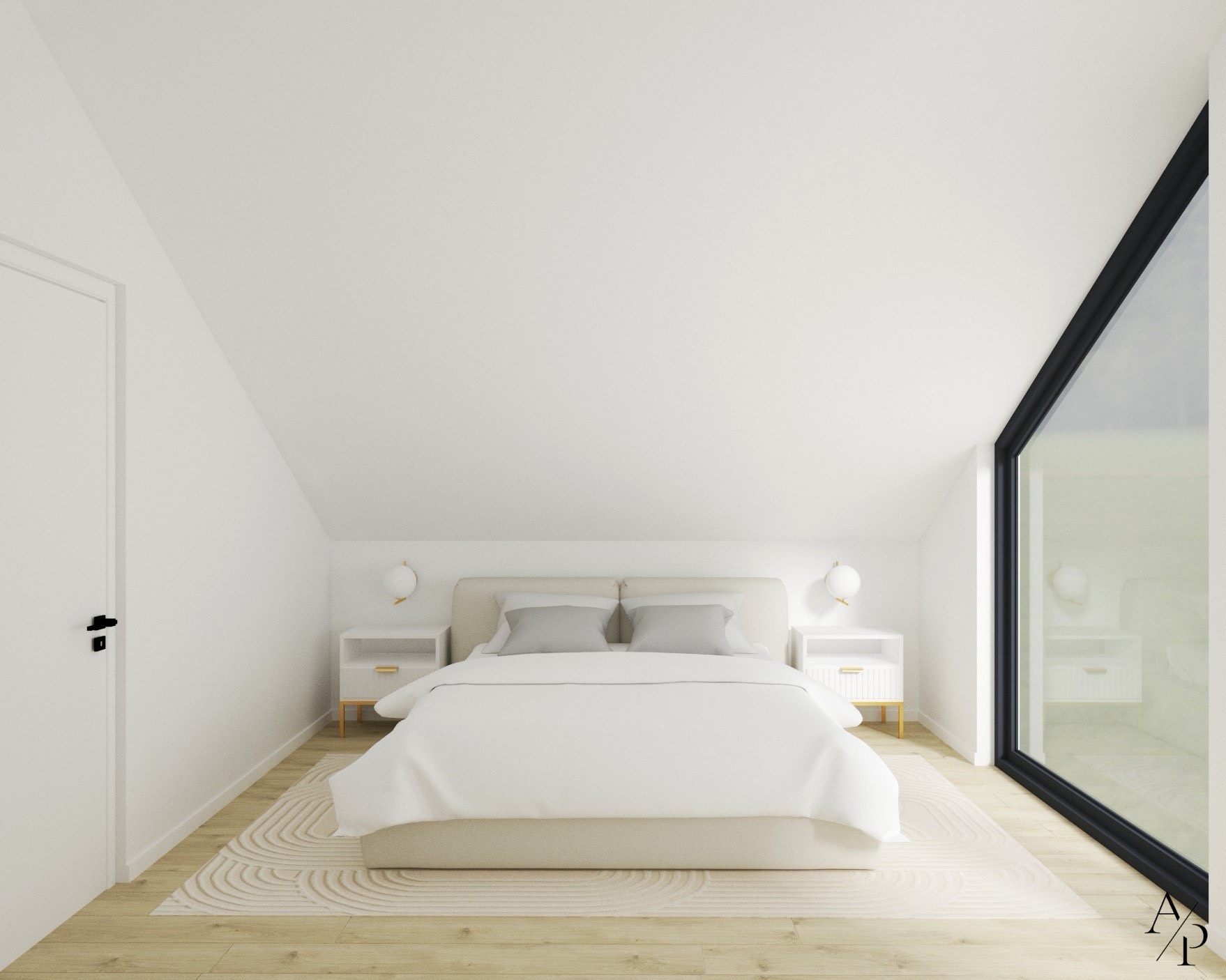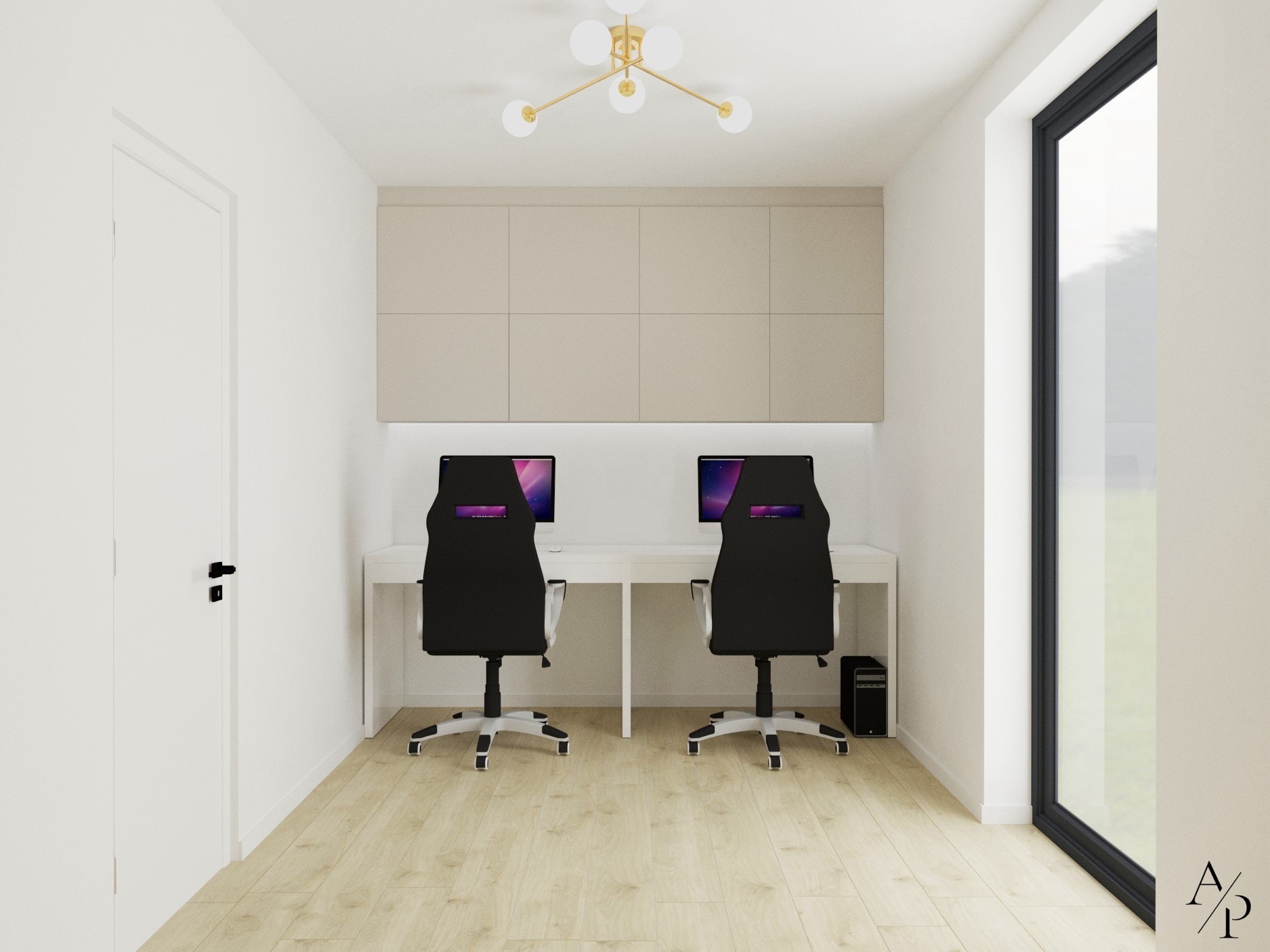 Projekt łączy funkcjonalność z estetyką, tworząc harmonijną i pełną światła przestrzeń. Dominują tu jasne, neutralne barwy, drewno oraz subtelne złote akcenty, które dodają wnętrzu elegancji. Otwarta kuchnia z wyspą i przestronną jadalnią to serce domu, natomiast domowe biuro zostało zaprojektowane z myślą o komforcie pracy – zawiera ergonomiczne stanowiska oraz dodatkową przestrzeń do odpoczynku. Sypialnia na poddaszu zachwyca prostotą i przytulnym charakterem, a całość wnętrza odzwierciedla nowoczesny styl życia i dbałość o detale.
