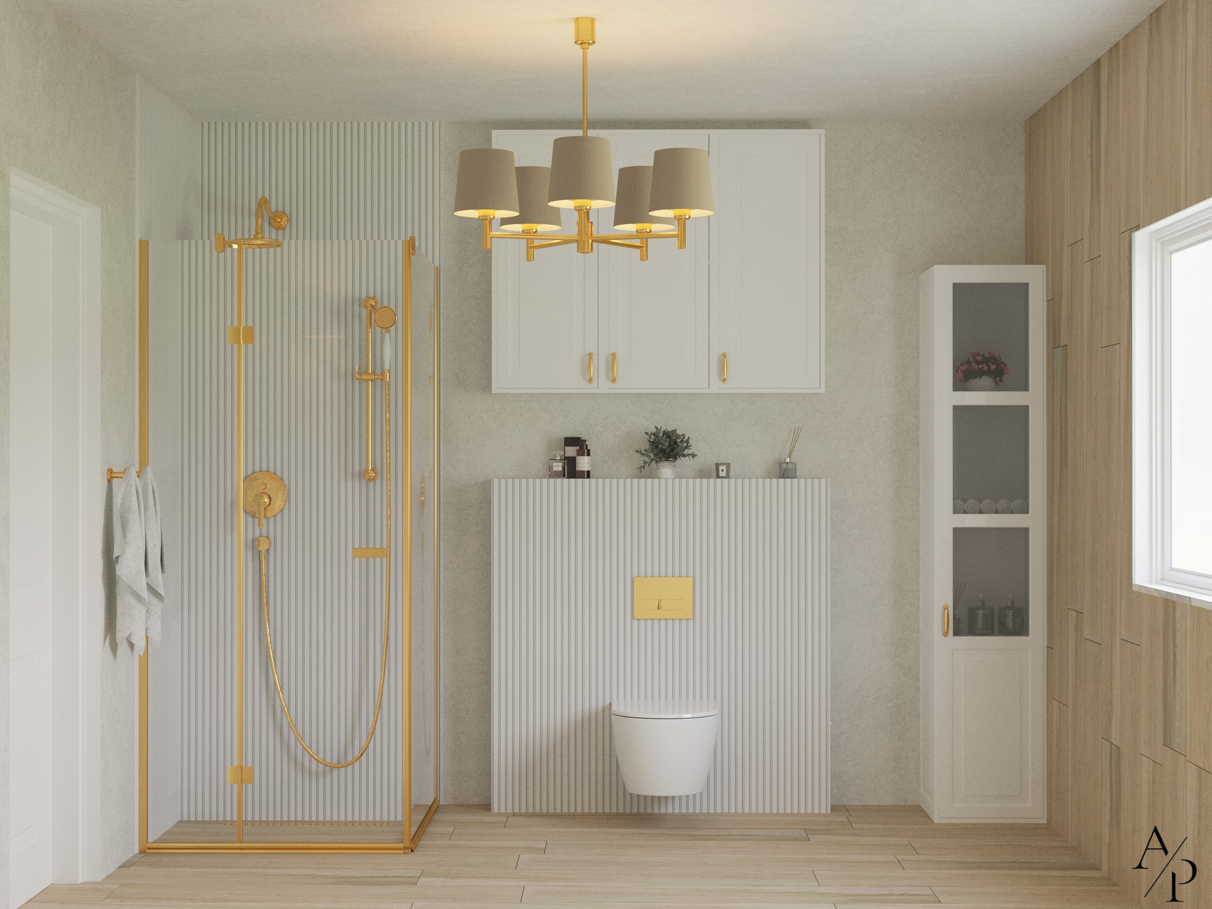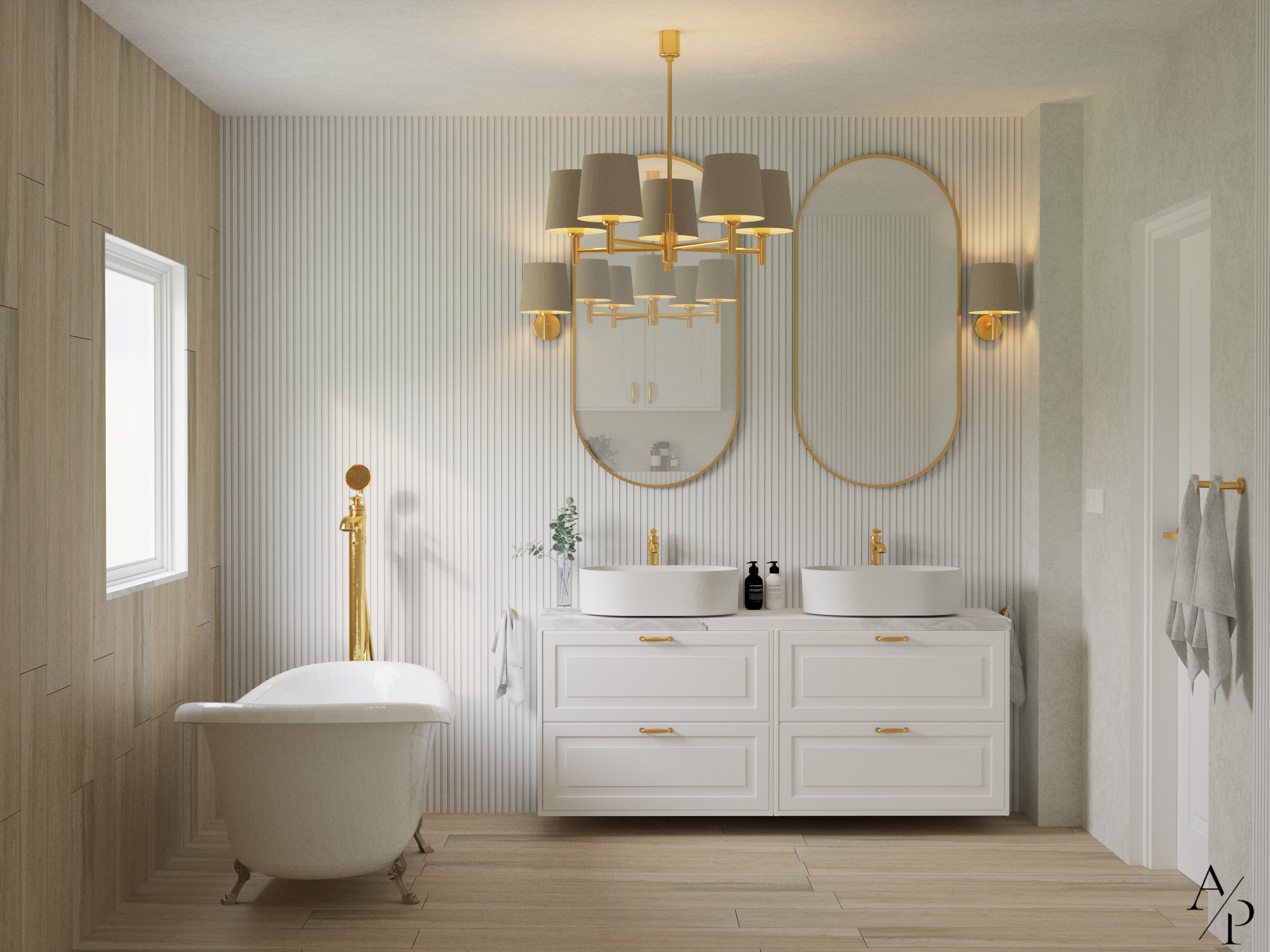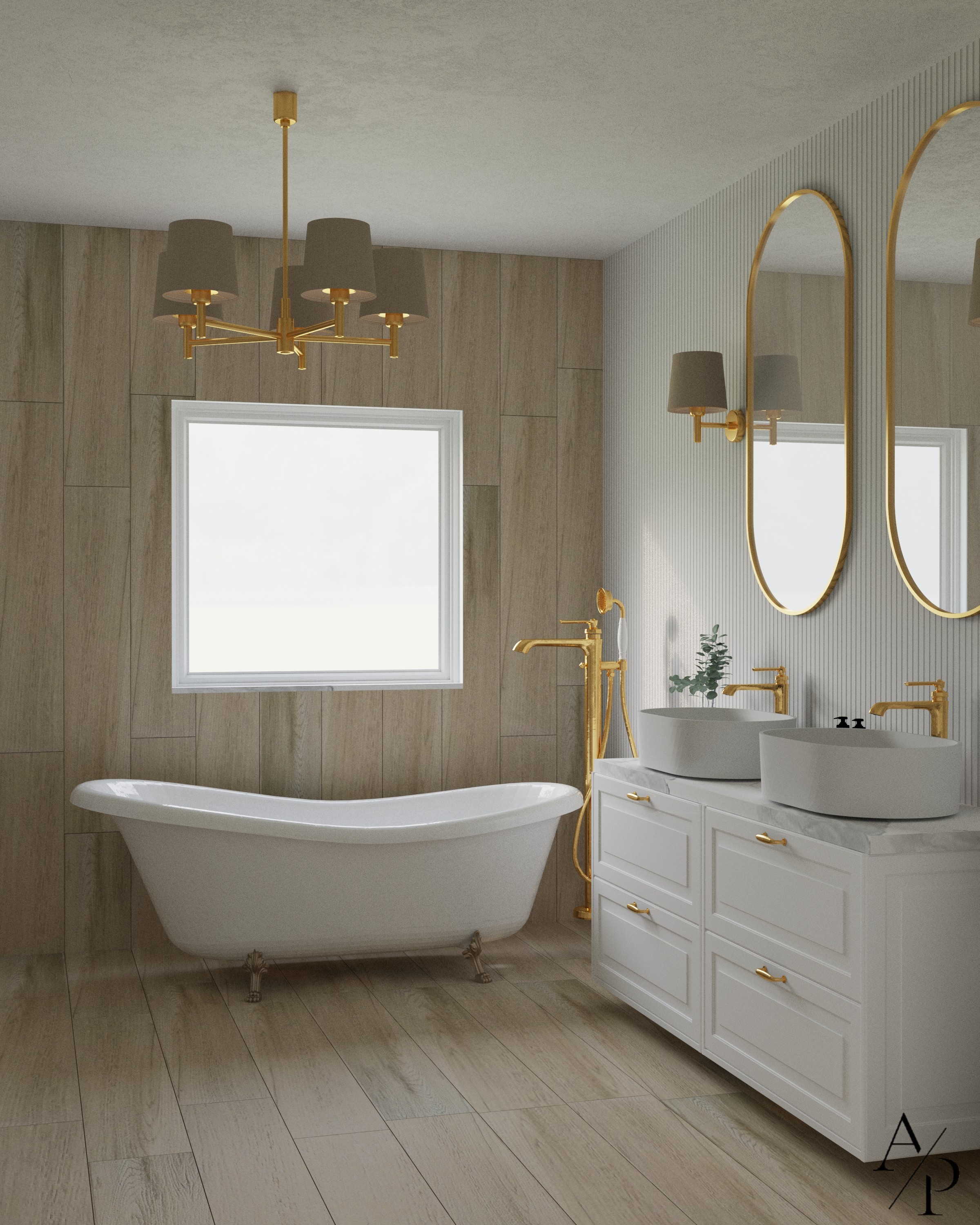 Wnętrze tej łazienki to połączenie elegancji i sielskiego uroku francuskiej prowincji. Kluczowym elementem aranżacji jest wolnostojąca wanna na stylizowanych nóżkach, ustawiona na tle subtelnych, drewnopodobnych płytek ściennych i podłogowych, które wprowadzają do wnętrza ciepło i naturalność. Złote baterie, uchwyty oraz oprawy oświetleniowe – zarówno kinkiety przy lustrach, jak i centralny żyrandol – dodają wnętrzu klasy i delikatnego blasku, tworząc wyrafinowany kontrast z matowymi fakturami mebli i ceramiki. Szafka z frezowanymi frontami w odcieniu złamanej bieli idealnie wpisuje się w estetykę francuskiego stylu rustykalnego. Zwieńczeniem całości są owalne lustra, które optycznie powiększają przestrzeń i podkreślają symetrię kompozycji. To projekt, który łączy romantyzm i funkcjonalność, tworząc przestrzeń sprzyjającą codziennemu relaksowi i estetycznym doznaniom.