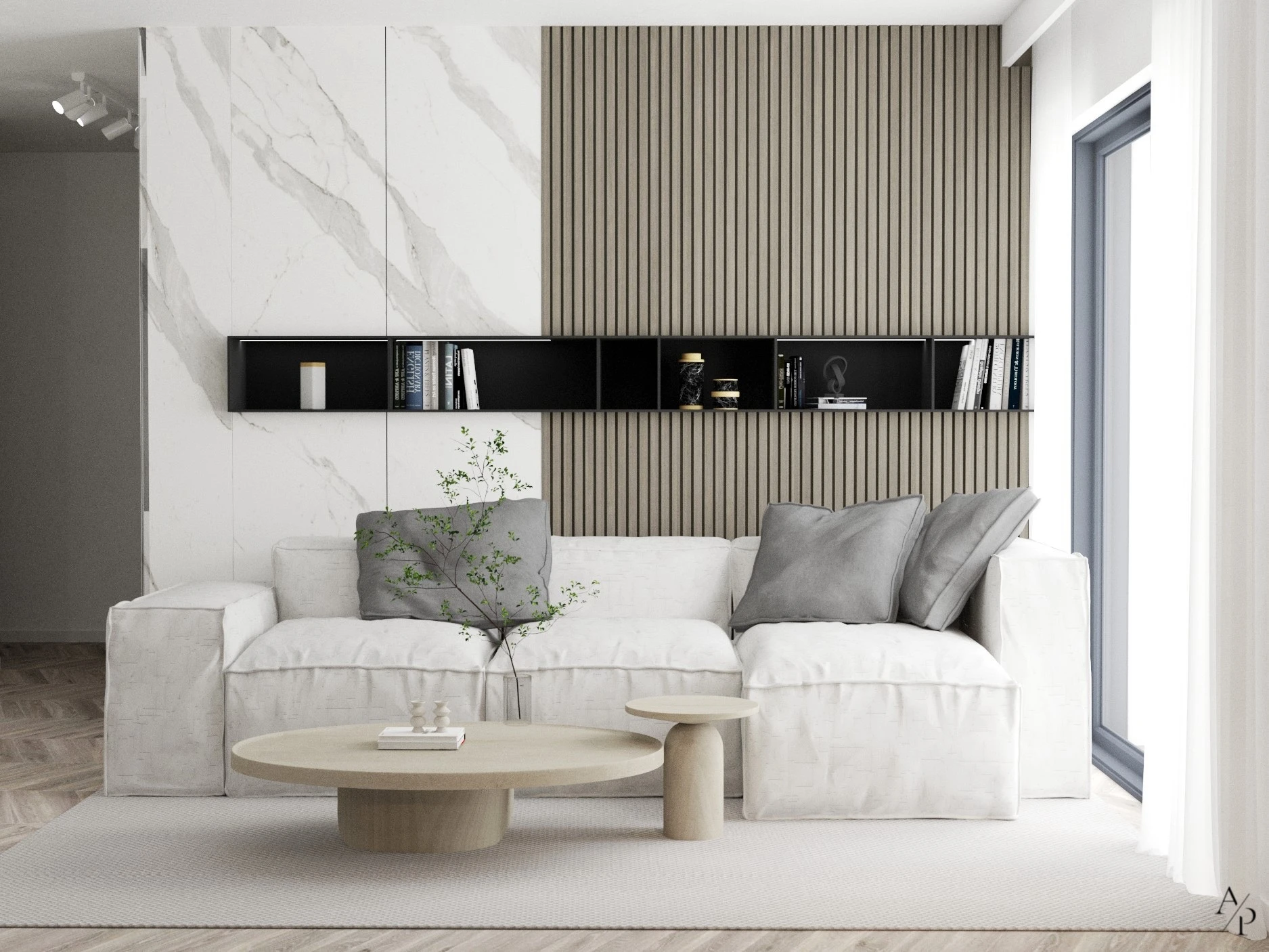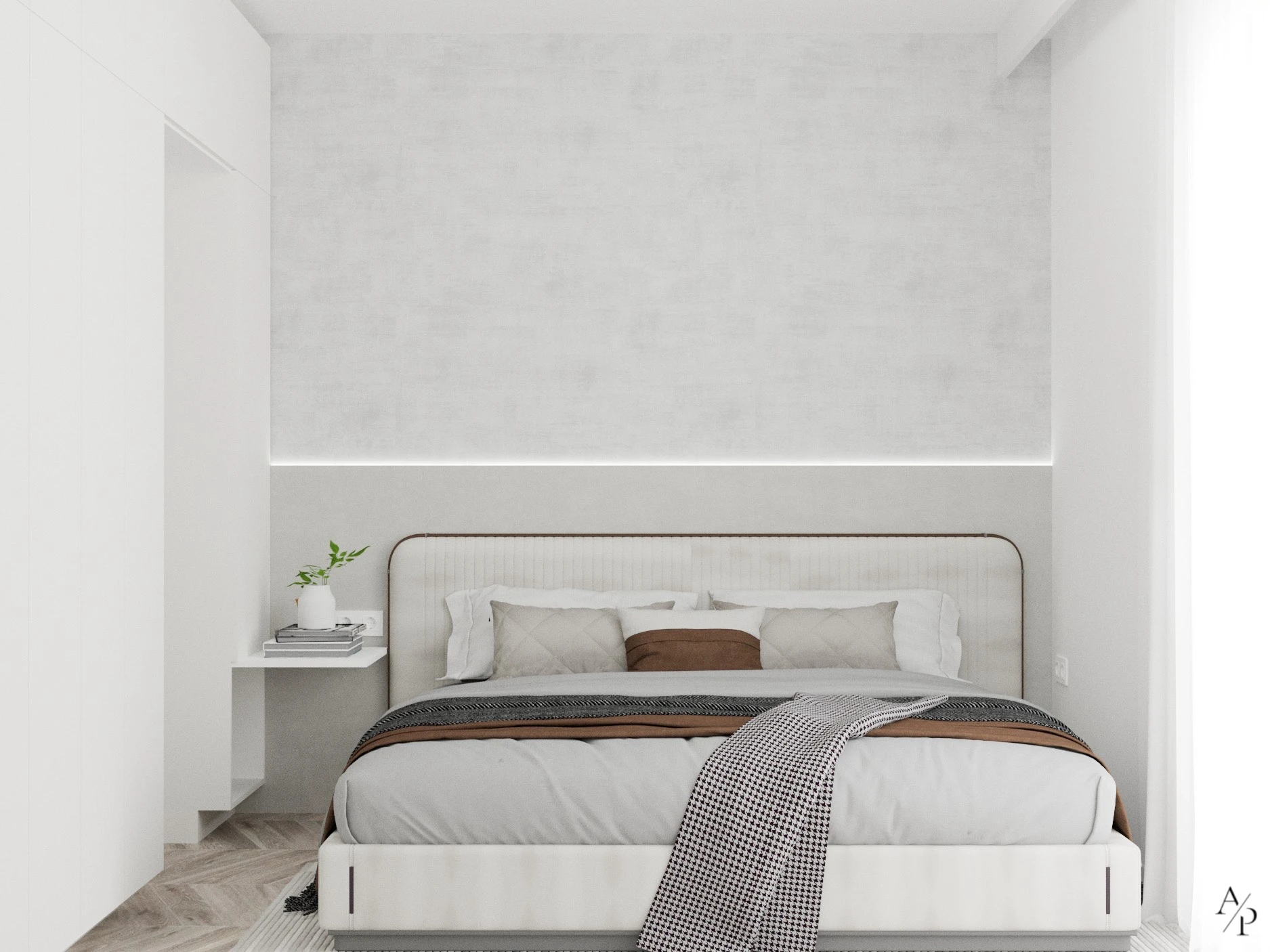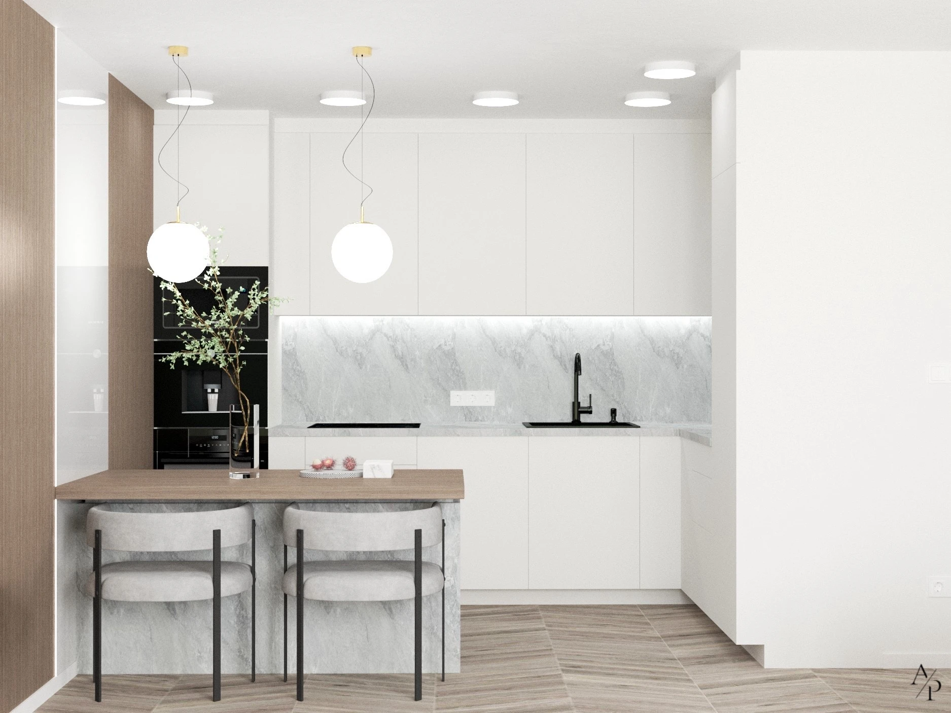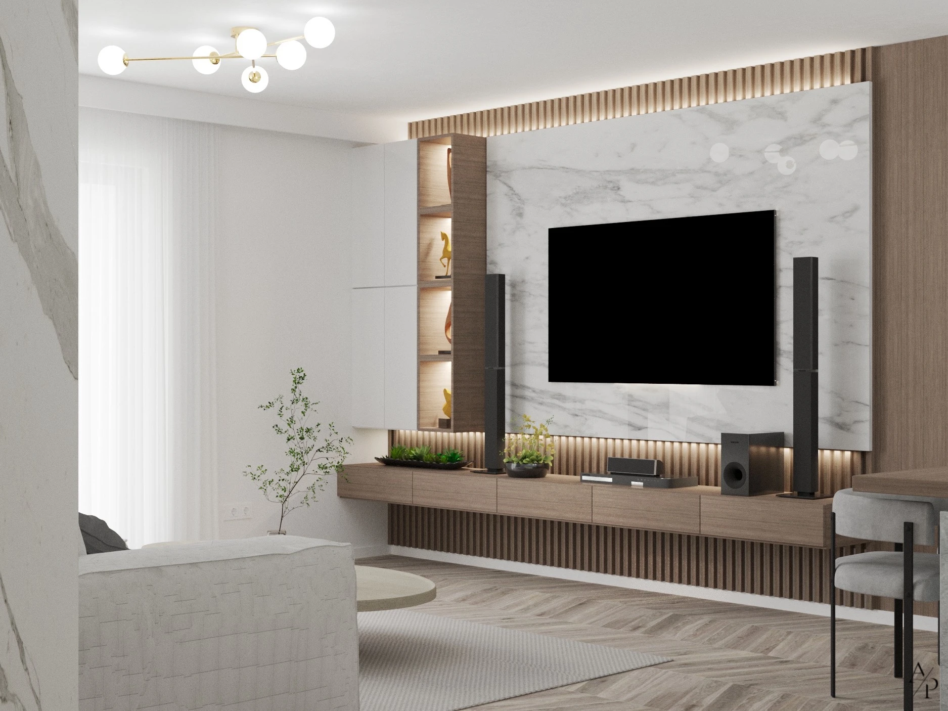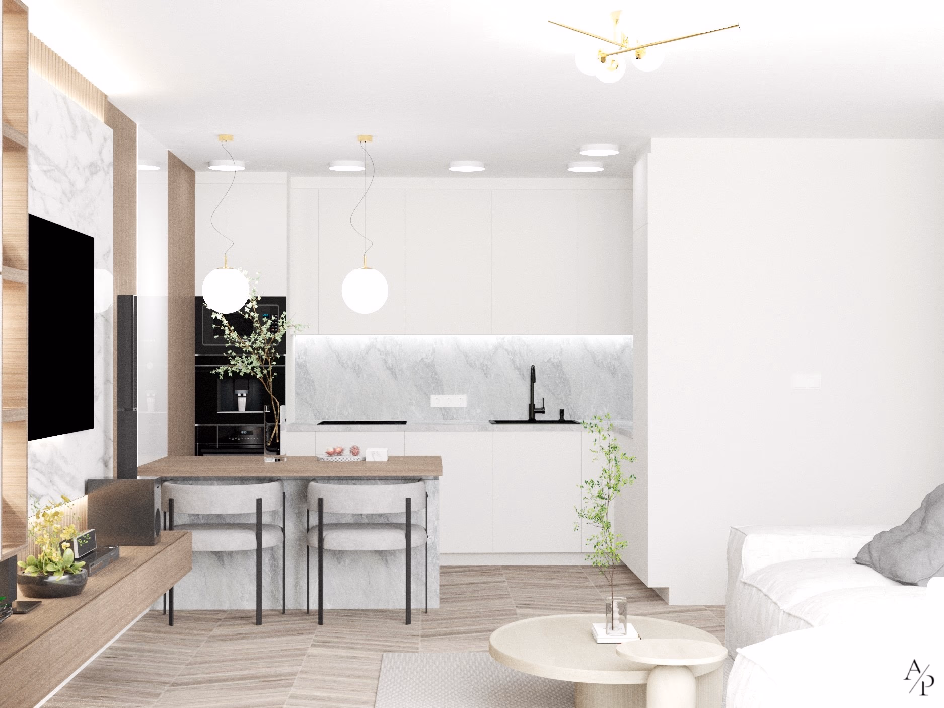 W ramach projektu zaprojektowano funkcjonalne i nowoczesne wnętrza obejmujące salon, jadalnię, kuchnię, sypialnię oraz korytarz. Całość utrzymana jest w stonowanej, spójnej kolorystyce, bazującej na jasnych odcieniach, naturalnym drewnie oraz subtelnych akcentach w postaci nowoczesnych rozwiązań. Wnętrza cechują się minimalistycznym i eleganckim designem, z wykorzystaniem wysokiej jakości materiałów, takich jak marmur, fornir drewniany czy tapicerowane tkaniny. Dominują ciepłe beże, biel oraz odcienie szarości, które w połączeniu z naturalnym światłem nadają przestrzeni przytulności. Zastosowane rozwiązania podkreślają nowoczesny styl mieszkania – ukryte uchwyty mebli, oświetlenie LED, ergonomiczne rozmieszczenie stref oraz subtelne detale dekoracyjne nadają wnętrzom harmonijny i funkcjonalny charakter. To wnętrze stworzone z myślą o komforcie, estetyce i ponadczasowej elegancji.